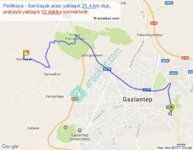 Perilikaya - Sarıbaşak arası yaklaşık olarak 90 km/h ile yukarıda belirtilen sürede olup, iki yerin kuş uçuşu uzaklığı (mesafesi) 16'dir. Yolculuk otobüsle 41 dakika sürmektedir.