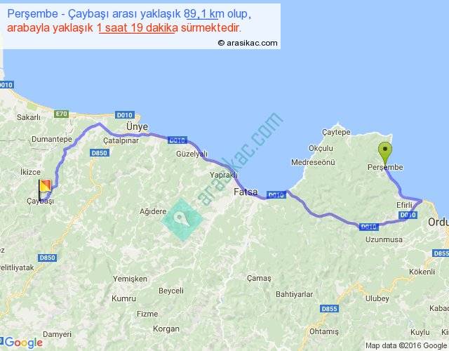 Perşembe - Çaybaşı arası yaklaşık olarak 90 km/h ile yukarıda belirtilen sürede olup, iki yerin kuş uçuşu uzaklığı (mesafesi) 57'dir. Yolculuk otobüsle 1 saat 42 dakika sürmektedir.