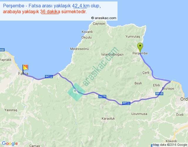 Perşembe - Fatsa arası yaklaşık olarak 90 km/h ile yukarıda belirtilen sürede olup, iki yerin kuş uçuşu uzaklığı (mesafesi) 23'dir. Yolculuk otobüsle 46 dakika sürmektedir.