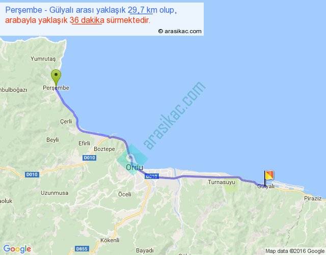 Perşembe - Gülyalı arası yaklaşık olarak 90 km/h ile yukarıda belirtilen sürede olup, iki yerin kuş uçuşu uzaklığı (mesafesi) 26'dir. Yolculuk otobüsle 46 dakika sürmektedir.