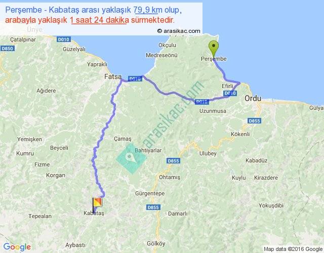 Perşembe - Kabataş arası yaklaşık olarak 90 km/h ile yukarıda belirtilen sürede olup, iki yerin kuş uçuşu uzaklığı (mesafesi) 44'dir. Yolculuk otobüsle 1 saat 49 dakika sürmektedir.
