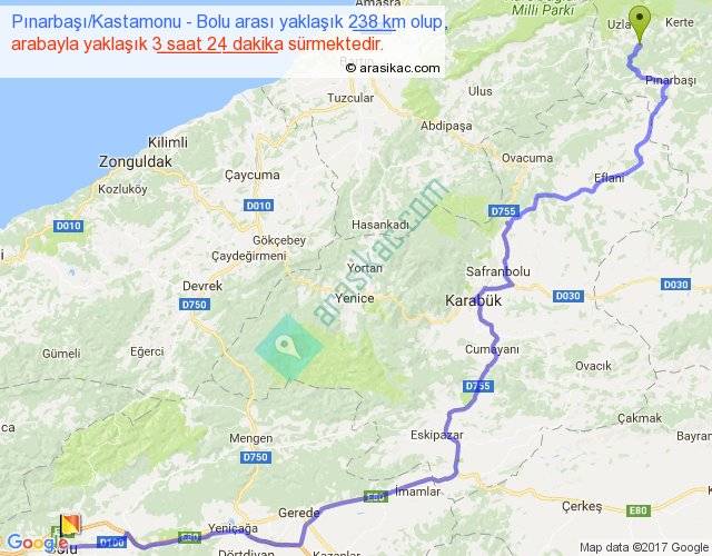 Pınarbaşı Kastamonu - Bolu arası yaklaşık olarak 90 km/h ile yukarıda belirtilen sürede olup, iki yerin kuş uçuşu uzaklığı (mesafesi) 157'dir. Yolculuk otobüsle 4 saat 25 dakika sürmektedir.
