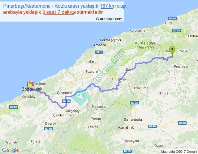 Pınarbaşı Kastamonu - Kozlu arası yaklaşık olarak 90 km/h ile yukarıda belirtilen sürede olup, iki yerin kuş uçuşu uzaklığı (mesafesi) 109'dir. Yolculuk otobüsle 4 saat 3 dakika sürmektedir.