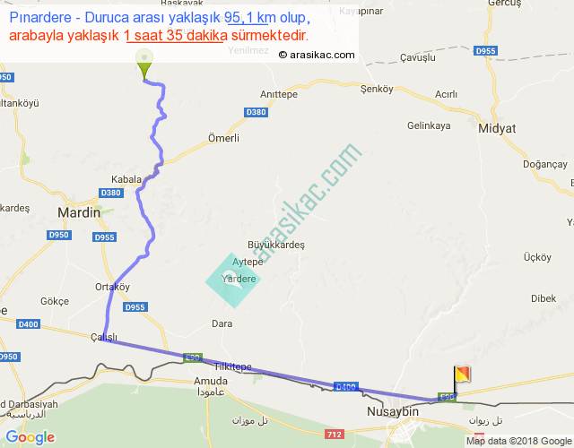 Pınardere - Duruca arası yaklaşık olarak 90 km/h ile yukarıda belirtilen sürede olup, iki yerin kuş uçuşu uzaklığı (mesafesi) 60'dir. Yolculuk otobüsle 2 saat 3 dakika sürmektedir.