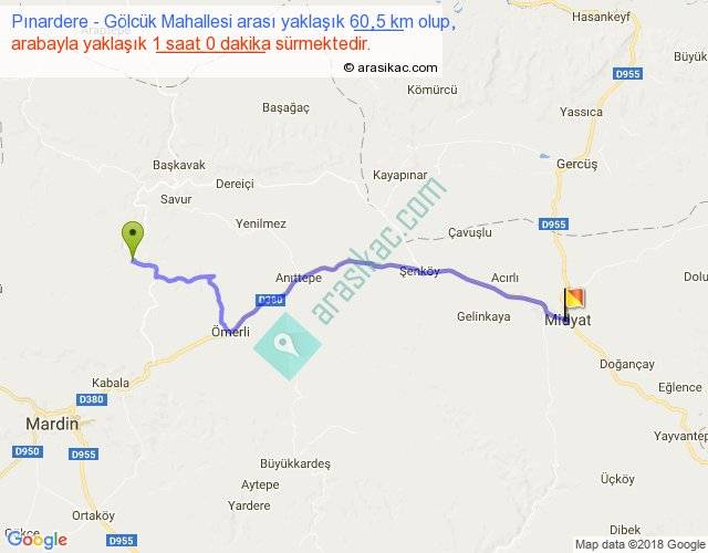 Pınardere - Gölcük Mahallesi arası yaklaşık olarak 90 km/h ile yukarıda belirtilen sürede olup, iki yerin kuş uçuşu uzaklığı (mesafesi) 48'dir. Yolculuk otobüsle 1 saat 18 dakika sürmektedir.