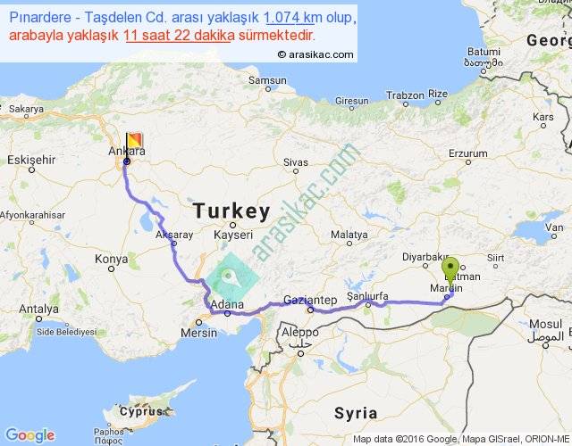 Pınardere - Taşdelen Cd. arası yaklaşık olarak 90 km/h ile yukarıda belirtilen sürede olup, iki yerin kuş uçuşu uzaklığı (mesafesi) 737'dir. Eğer belirtilen yerler arasında uçak seferi var ise bu süre uçakla 1 saat 08 dakika'ya kadar düşebilir. Yolculuk otobüsle 14 saat 46 dakika sürmektedir.