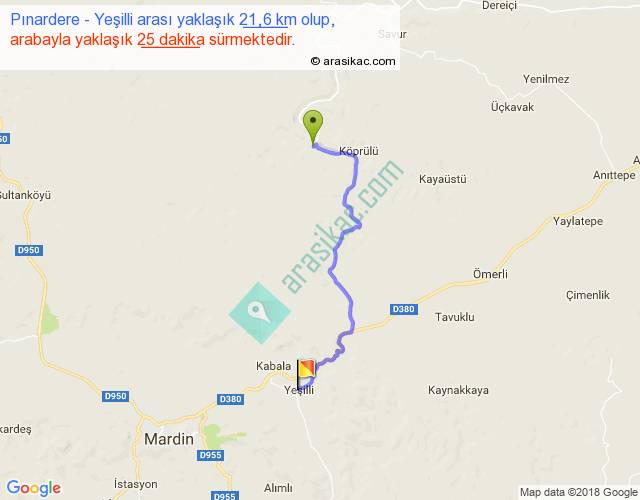Pınardere - Yeşilli arası yaklaşık olarak 90 km/h ile yukarıda belirtilen sürede olup, iki yerin kuş uçuşu uzaklığı (mesafesi) 15'dir. Yolculuk otobüsle 32 dakika sürmektedir.