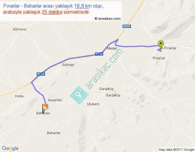 Pınarlar - Baharlar arası yaklaşık olarak 90 km/h ile yukarıda belirtilen sürede olup, iki yerin kuş uçuşu uzaklığı (mesafesi) 13'dir. Yolculuk otobüsle 32 dakika sürmektedir.