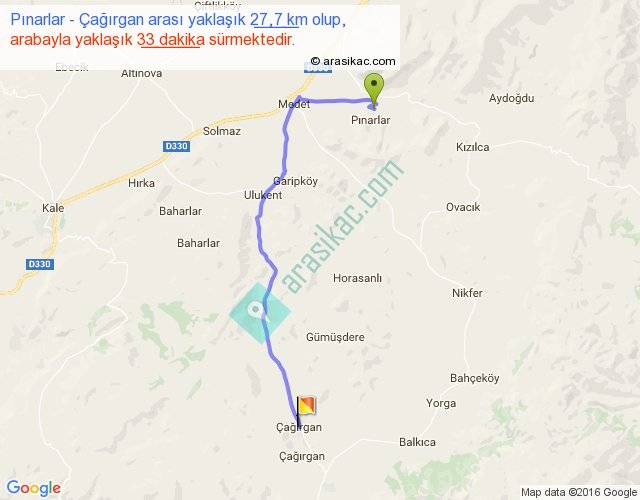 Pınarlar - Çağırgan arası yaklaşık olarak 90 km/h ile yukarıda belirtilen sürede olup, iki yerin kuş uçuşu uzaklığı (mesafesi) 20'dir. Yolculuk otobüsle 42 dakika sürmektedir.