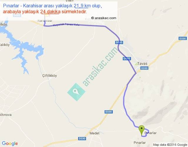Pınarlar - Karahisar arası yaklaşık olarak 90 km/h ile yukarıda belirtilen sürede olup, iki yerin kuş uçuşu uzaklığı (mesafesi) 15'dir. Yolculuk otobüsle 31 dakika sürmektedir.