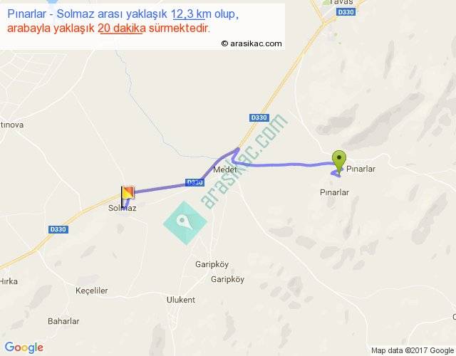 Pınarlar - Solmaz arası yaklaşık olarak 90 km/h ile yukarıda belirtilen sürede olup, iki yerin kuş uçuşu uzaklığı (mesafesi) 9'dir. Yolculuk otobüsle 26 dakika sürmektedir.