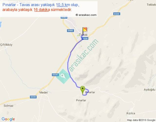 Pınarlar - Tavas arası yaklaşık olarak 90 km/h ile yukarıda belirtilen sürede olup, iki yerin kuş uçuşu uzaklığı (mesafesi) 7'dir. Yolculuk otobüsle 20 dakika sürmektedir.