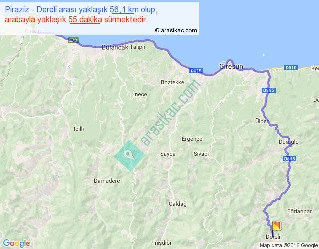 Piraziz - Dereli arası yaklaşık olarak 90 km/h ile yukarıda belirtilen sürede olup, iki yerin kuş uçuşu uzaklığı (mesafesi) 36'dir. Yolculuk otobüsle 1 saat 11 dakika sürmektedir.