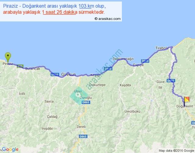 Piraziz - Doğankent arası yaklaşık olarak 90 km/h ile yukarıda belirtilen sürede olup, iki yerin kuş uçuşu uzaklığı (mesafesi) 68'dir. Yolculuk otobüsle 1 saat 51 dakika sürmektedir.