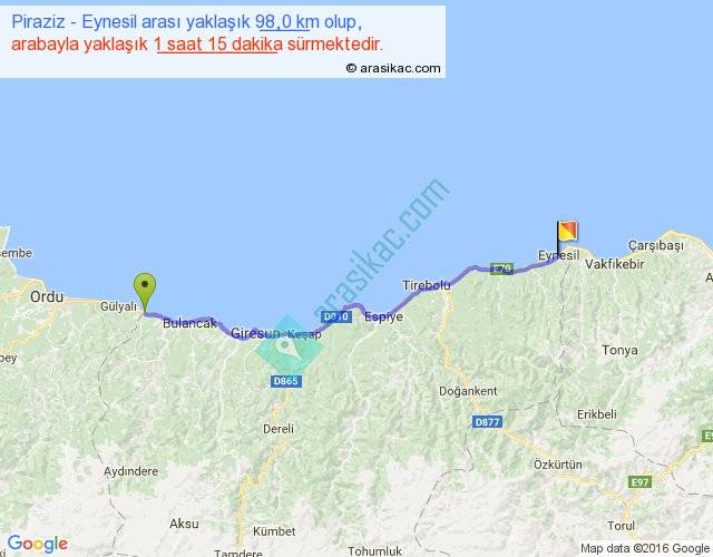 Piraziz - Eynesil arası yaklaşık olarak 90 km/h ile yukarıda belirtilen sürede olup, iki yerin kuş uçuşu uzaklığı (mesafesi) 86'dir. Yolculuk otobüsle 1 saat 37 dakika sürmektedir.