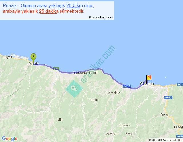Piraziz - Giresun arası yaklaşık olarak 90 km/h ile yukarıda belirtilen sürede olup, iki yerin kuş uçuşu uzaklığı (mesafesi) 23'dir. Yolculuk otobüsle 32 dakika sürmektedir.