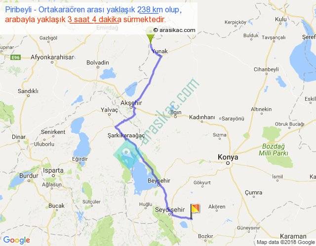 Piribeyli - Ortakaraören arası yaklaşık olarak 90 km/h ile yukarıda belirtilen sürede olup, iki yerin kuş uçuşu uzaklığı (mesafesi) 174'dir. Yolculuk otobüsle 3 saat 59 dakika sürmektedir.