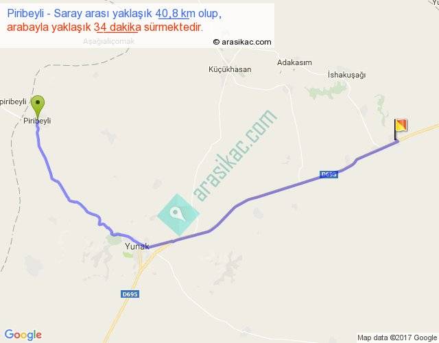 Piribeyli - Saray arası yaklaşık olarak 90 km/h ile yukarıda belirtilen sürede olup, iki yerin kuş uçuşu uzaklığı (mesafesi) 31'dir. Yolculuk otobüsle 44 dakika sürmektedir.