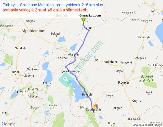Piribeyli - Sofuhane Mahallesi arası yaklaşık olarak 90 km/h ile yukarıda belirtilen sürede olup, iki yerin kuş uçuşu uzaklığı (mesafesi) 166'dir. Yolculuk otobüsle 3 saat 38 dakika sürmektedir.