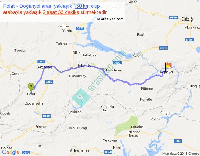 Polat - Doğanyol arası yaklaşık olarak 90 km/h ile yukarıda belirtilen sürede olup, iki yerin kuş uçuşu uzaklığı (mesafesi) 104'dir. Yolculuk otobüsle 3 saat 18 dakika sürmektedir.