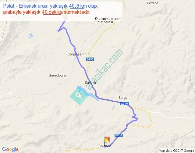 Polat - Erkenek arası yaklaşık olarak 90 km/h ile yukarıda belirtilen sürede olup, iki yerin kuş uçuşu uzaklığı (mesafesi) 26'dir. Yolculuk otobüsle 52 dakika sürmektedir.