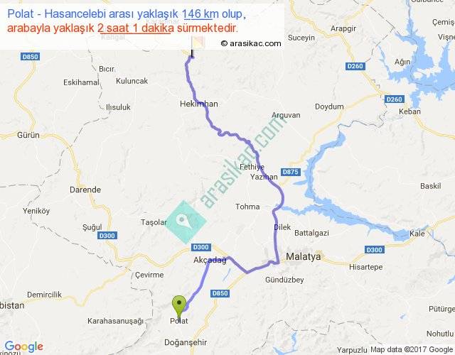 Polat - Hasancelebi arası yaklaşık olarak 90 km/h ile yukarıda belirtilen sürede olup, iki yerin kuş uçuşu uzaklığı (mesafesi) 88'dir. Yolculuk otobüsle 2 saat 37 dakika sürmektedir.