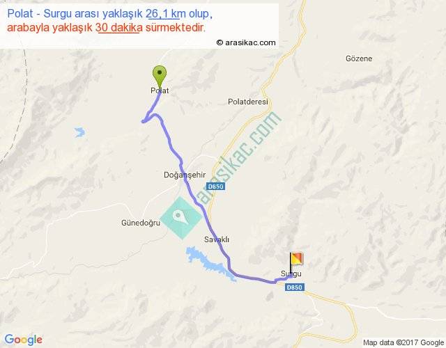 Polat - Surgu arası yaklaşık olarak 90 km/h ile yukarıda belirtilen sürede olup, iki yerin kuş uçuşu uzaklığı (mesafesi) 19'dir. Yolculuk otobüsle 39 dakika sürmektedir.