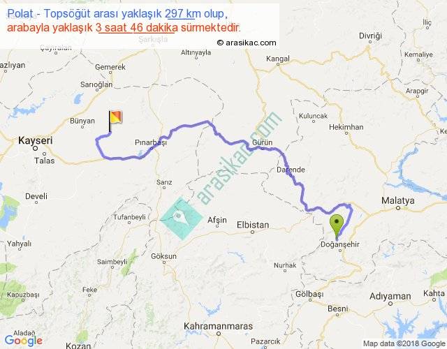 Polat - Topsöğüt arası yaklaşık olarak 90 km/h ile yukarıda belirtilen sürede olup, iki yerin kuş uçuşu uzaklığı (mesafesi) 171'dir. Yolculuk otobüsle 4 saat 53 dakika sürmektedir.