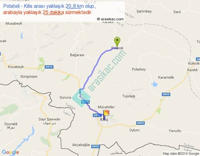 Polateli - Kilis arası yaklaşık olarak 90 km/h ile yukarıda belirtilen sürede olup, iki yerin kuş uçuşu uzaklığı (mesafesi) 14'dir. Yolculuk otobüsle 32 dakika sürmektedir.