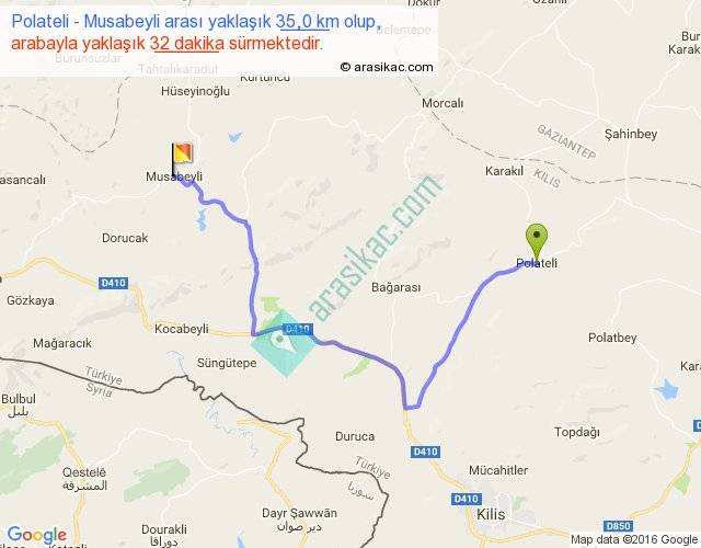 Polateli - Musabeyli arası yaklaşık olarak 90 km/h ile yukarıda belirtilen sürede olup, iki yerin kuş uçuşu uzaklığı (mesafesi) 21'dir. Yolculuk otobüsle 41 dakika sürmektedir.