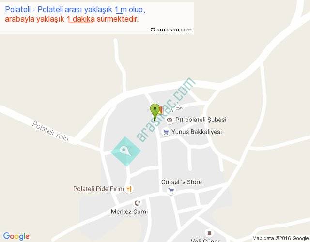 Polateli - Polateli arası yaklaşık olarak 90 km/h ile yukarıda belirtilen sürede olup, iki yerin kuş uçuşu uzaklığı (mesafesi) 0'dir. Yolculuk otobüsle 1 dakika sürmektedir.