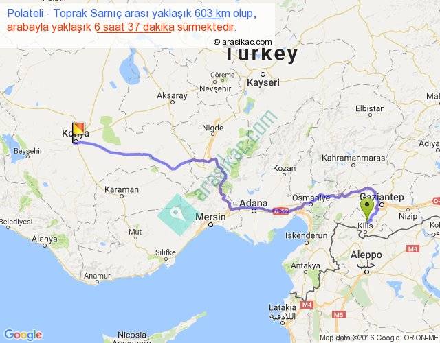 Polateli - Toprak Sarnıç arası yaklaşık olarak 90 km/h ile yukarıda belirtilen sürede olup, iki yerin kuş uçuşu uzaklığı (mesafesi) 427'dir. Eğer belirtilen yerler arasında uçak seferi var ise bu süre uçakla 39 dakika'ya kadar düşebilir. Yolculuk otobüsle 8 saat 36 dakika sürmektedir.