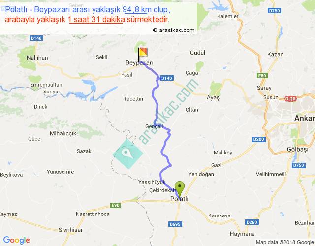 Polatlı - Beypazarı arası yaklaşık olarak 90 km/h ile yukarıda belirtilen sürede olup, iki yerin kuş uçuşu uzaklığı (mesafesi) 67'dir. Yolculuk otobüsle 1 saat 53 dakika sürmektedir.