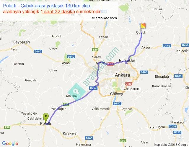 Polatlı - Çubuk arası yaklaşık olarak 90 km/h ile yukarıda belirtilen sürede olup, iki yerin kuş uçuşu uzaklığı (mesafesi) 104'dir. Yolculuk otobüsle 1 saat 59 dakika sürmektedir.