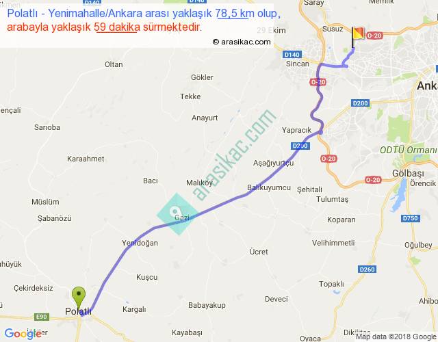 Polatlı - Yenimahalle Ankara arası yaklaşık olarak 90 km/h ile yukarıda belirtilen sürede olup, iki yerin kuş uçuşu uzaklığı (mesafesi) 65'dir. Yolculuk otobüsle 1 saat 12 dakika sürmektedir.