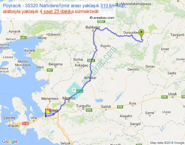 Poyracık - 35320 Narlıdere İzmir arası yaklaşık olarak 90 km/h ile yukarıda belirtilen sürede olup, iki yerin kuş uçuşu uzaklığı (mesafesi) 201'dir. Yolculuk otobüsle 5 saat 41 dakika sürmektedir.