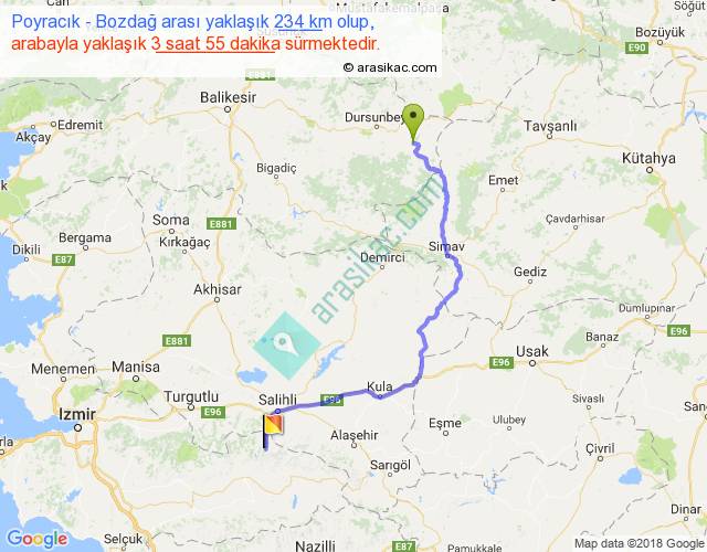 Poyracık - Bozdağ arası yaklaşık olarak 90 km/h ile yukarıda belirtilen sürede olup, iki yerin kuş uçuşu uzaklığı (mesafesi) 145'dir. Yolculuk otobüsle 5 saat 5 dakika sürmektedir.