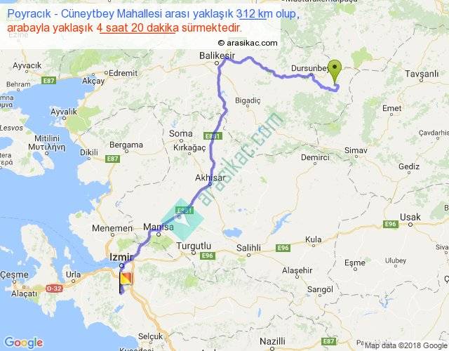 Poyracık - Cüneytbey Mahallesi arası yaklaşık olarak 90 km/h ile yukarıda belirtilen sürede olup, iki yerin kuş uçuşu uzaklığı (mesafesi) 201'dir. Yolculuk otobüsle 5 saat 38 dakika sürmektedir.