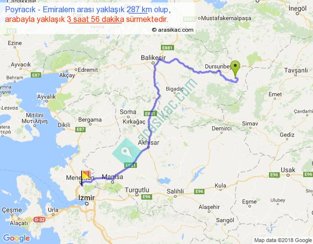 Poyracık - Emiralem arası yaklaşık olarak 90 km/h ile yukarıda belirtilen sürede olup, iki yerin kuş uçuşu uzaklığı (mesafesi) 181'dir. Yolculuk otobüsle 5 saat 6 dakika sürmektedir.
