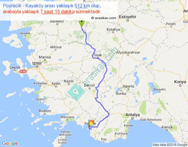 Poyracık - Kayaköy arası yaklaşık olarak 90 km/h ile yukarıda belirtilen sürede olup, iki yerin kuş uçuşu uzaklığı (mesafesi) 327'dir. Eğer belirtilen yerler arasında uçak seferi var ise bu süre uçakla 30 dakika'ya kadar düşebilir. Yolculuk otobüsle 9 saat 25 dakika sürmektedir.