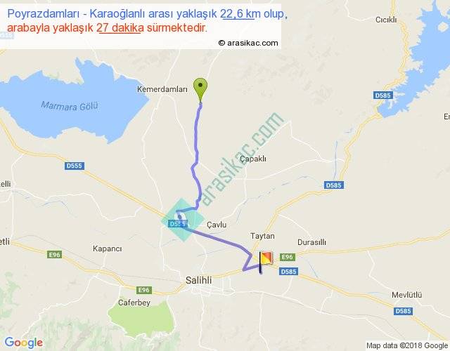 Poyrazdamları - Karaoğlanlı arası yaklaşık olarak 90 km/h ile yukarıda belirtilen sürede olup, iki yerin kuş uçuşu uzaklığı (mesafesi) 15'dir. Yolculuk otobüsle 35 dakika sürmektedir.