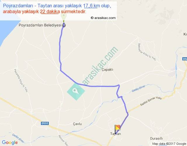 Poyrazdamları - Taytan arası yaklaşık olarak 90 km/h ile yukarıda belirtilen sürede olup, iki yerin kuş uçuşu uzaklığı (mesafesi) 12'dir. Yolculuk otobüsle 28 dakika sürmektedir.