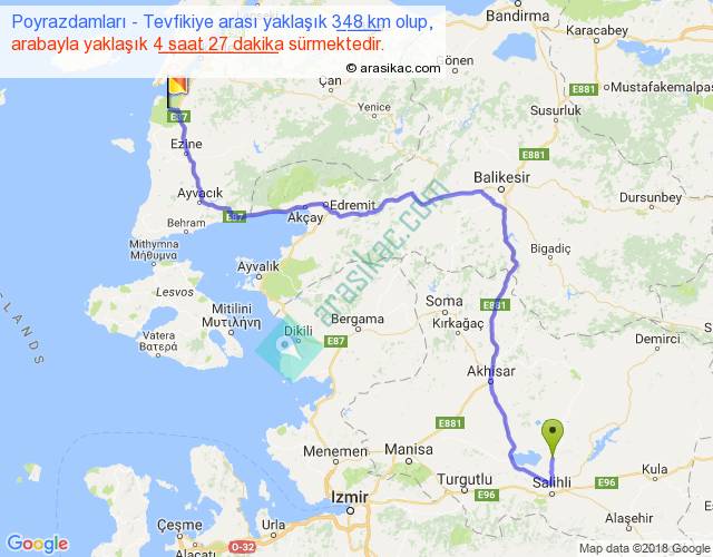 Poyrazdamları - Tevfikiye arası yaklaşık olarak 90 km/h ile yukarıda belirtilen sürede olup, iki yerin kuş uçuşu uzaklığı (mesafesi) 219'dir. Yolculuk otobüsle 5 saat 47 dakika sürmektedir.