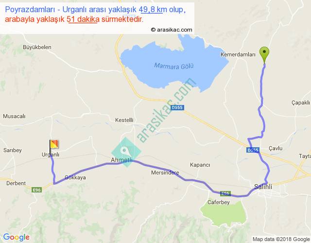 Poyrazdamları - Urganlı arası yaklaşık olarak 90 km/h ile yukarıda belirtilen sürede olup, iki yerin kuş uçuşu uzaklığı (mesafesi) 28'dir. Yolculuk otobüsle 1 saat 6 dakika sürmektedir.