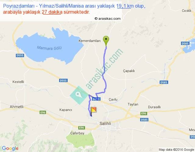 Poyrazdamları - Yılmaz Salihli Manisa arası yaklaşık olarak 90 km/h ile yukarıda belirtilen sürede olup, iki yerin kuş uçuşu uzaklığı (mesafesi) 14'dir. Yolculuk otobüsle 35 dakika sürmektedir.