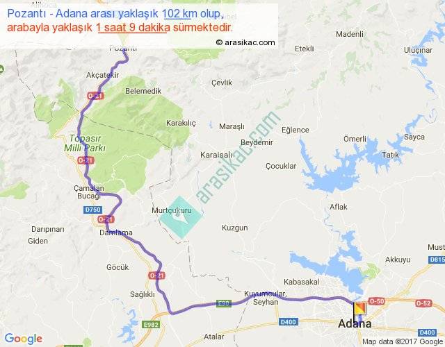 Pozantı - Adana arası yaklaşık olarak 90 km/h ile yukarıda belirtilen sürede olup, iki yerin kuş uçuşu uzaklığı (mesafesi) 49'dir. Yolculuk otobüsle 2 saat 50 dakika sürmektedir.