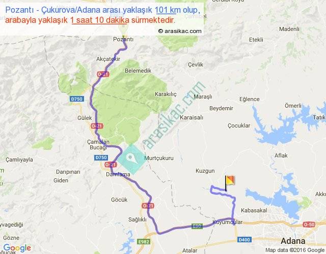 Pozantı - Çukurova Adana arası yaklaşık olarak 90 km/h ile yukarıda belirtilen sürede olup, iki yerin kuş uçuşu uzaklığı (mesafesi) 43'dir. Yolculuk otobüsle 1 saat 31 dakika sürmektedir.
