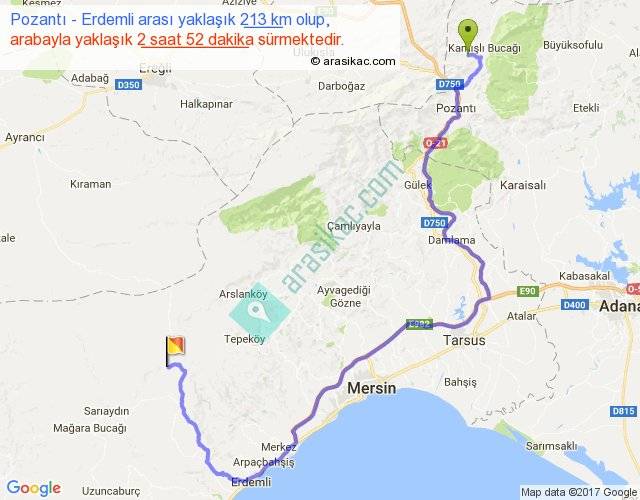 Pozantı - Erdemli arası yaklaşık olarak 90 km/h ile yukarıda belirtilen sürede olup, iki yerin kuş uçuşu uzaklığı (mesafesi) 105'dir. Yolculuk otobüsle 3 saat 43 dakika sürmektedir.