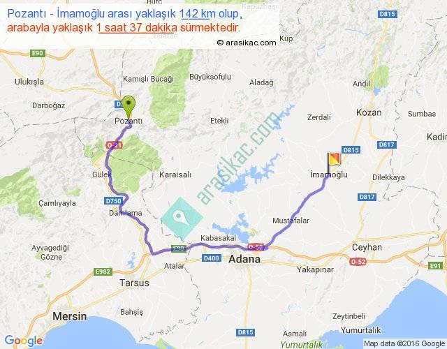Pozantı - İmamoğlu arası yaklaşık olarak 90 km/h ile yukarıda belirtilen sürede olup, iki yerin kuş uçuşu uzaklığı (mesafesi) 72'dir. Yolculuk otobüsle 2 saat 6 dakika sürmektedir.
