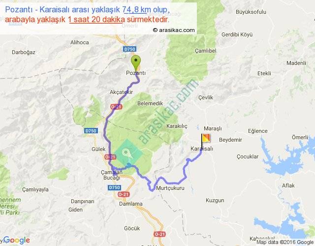 Pozantı - Karaisalı arası yaklaşık olarak 90 km/h ile yukarıda belirtilen sürede olup, iki yerin kuş uçuşu uzaklığı (mesafesi) 25'dir. Yolculuk otobüsle 1 saat 44 dakika sürmektedir.